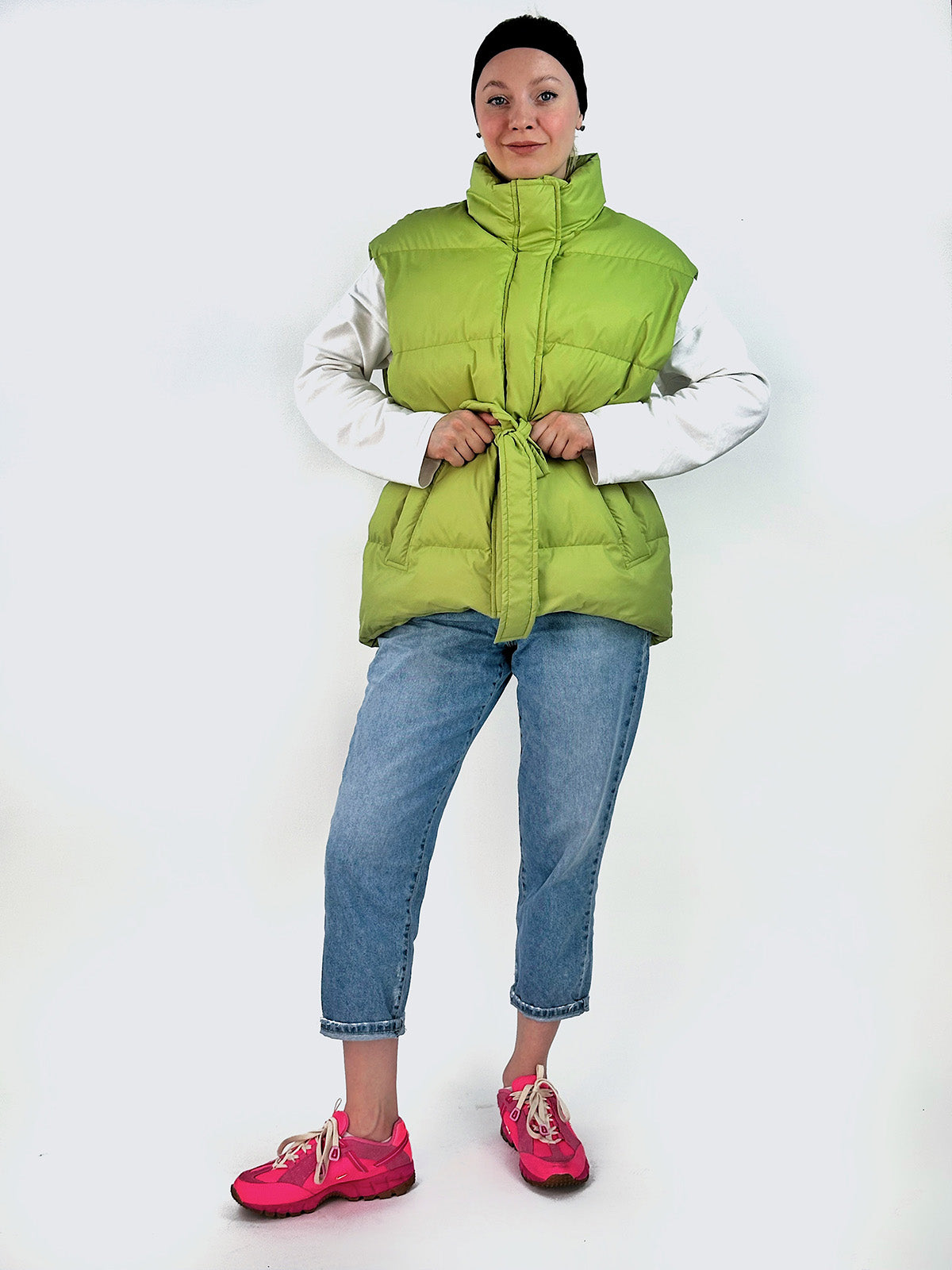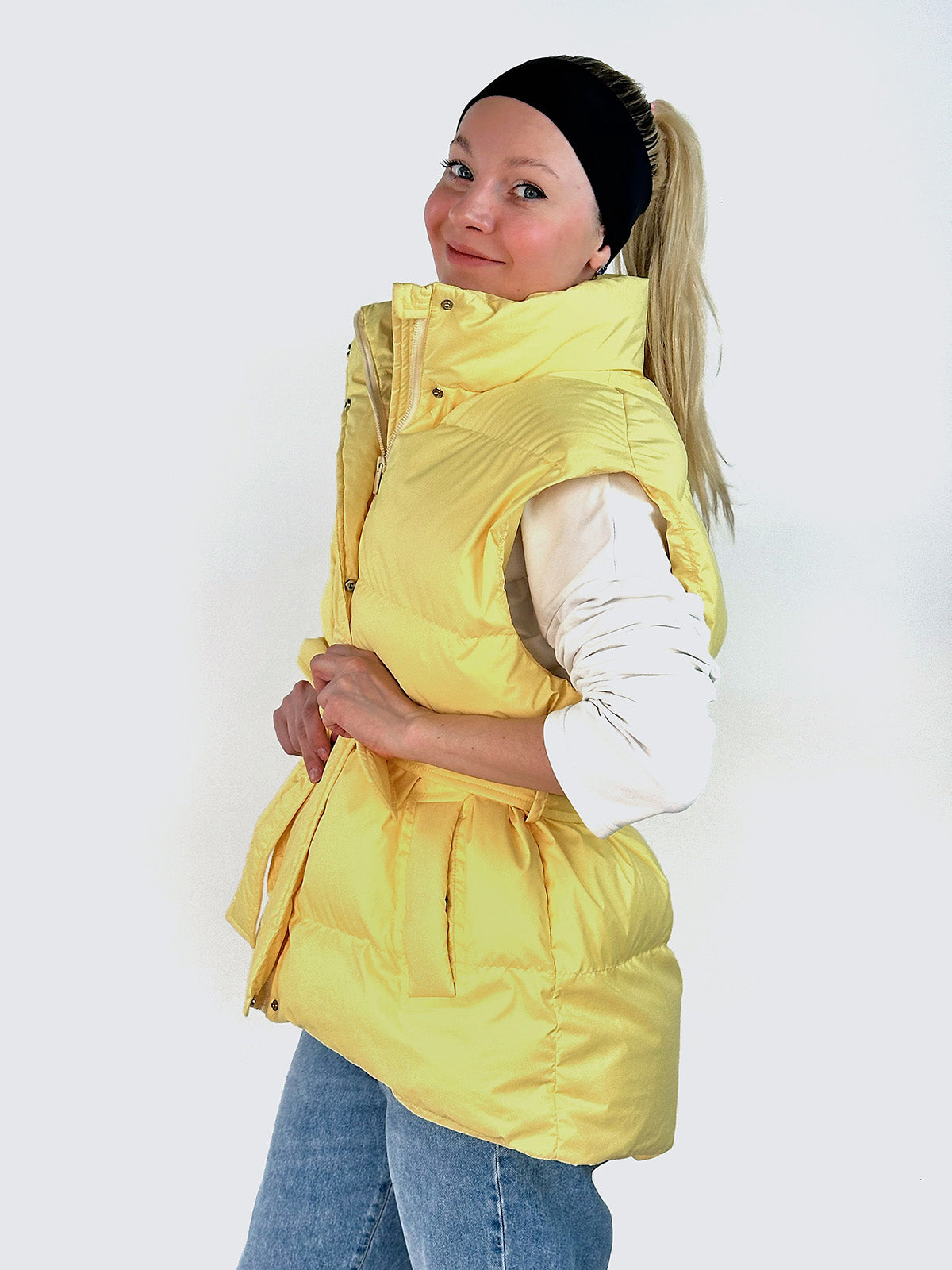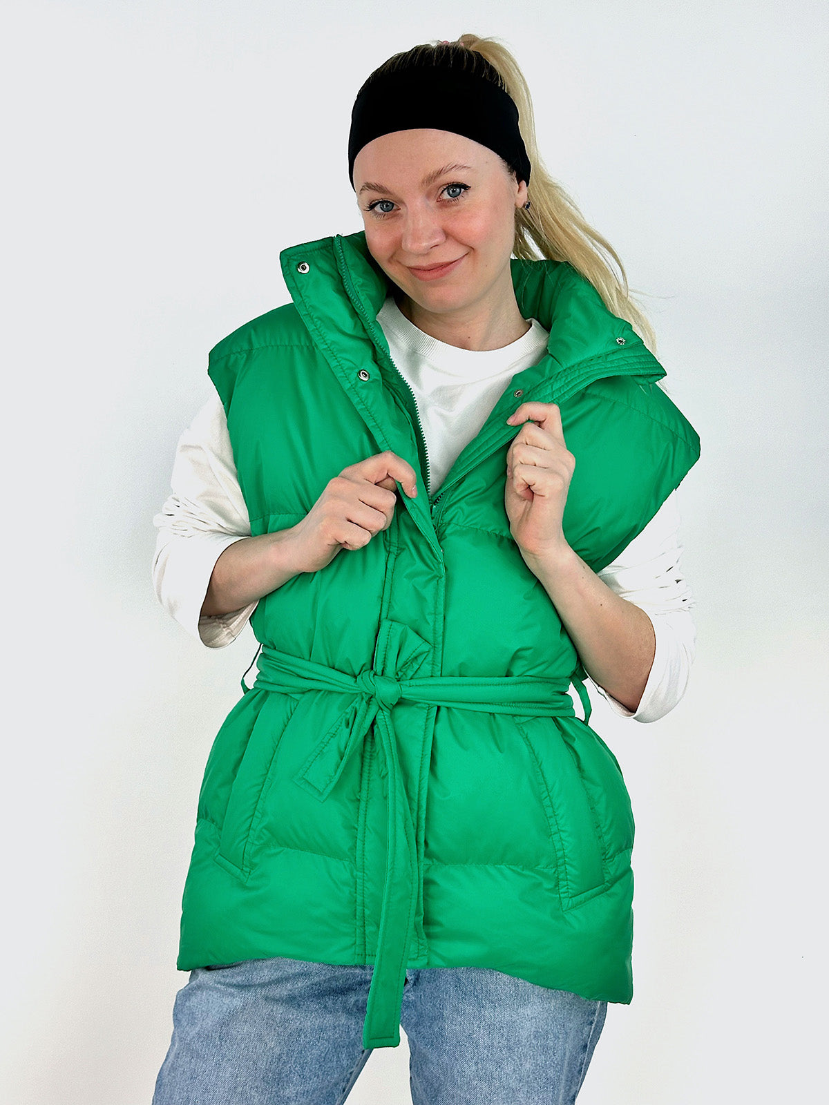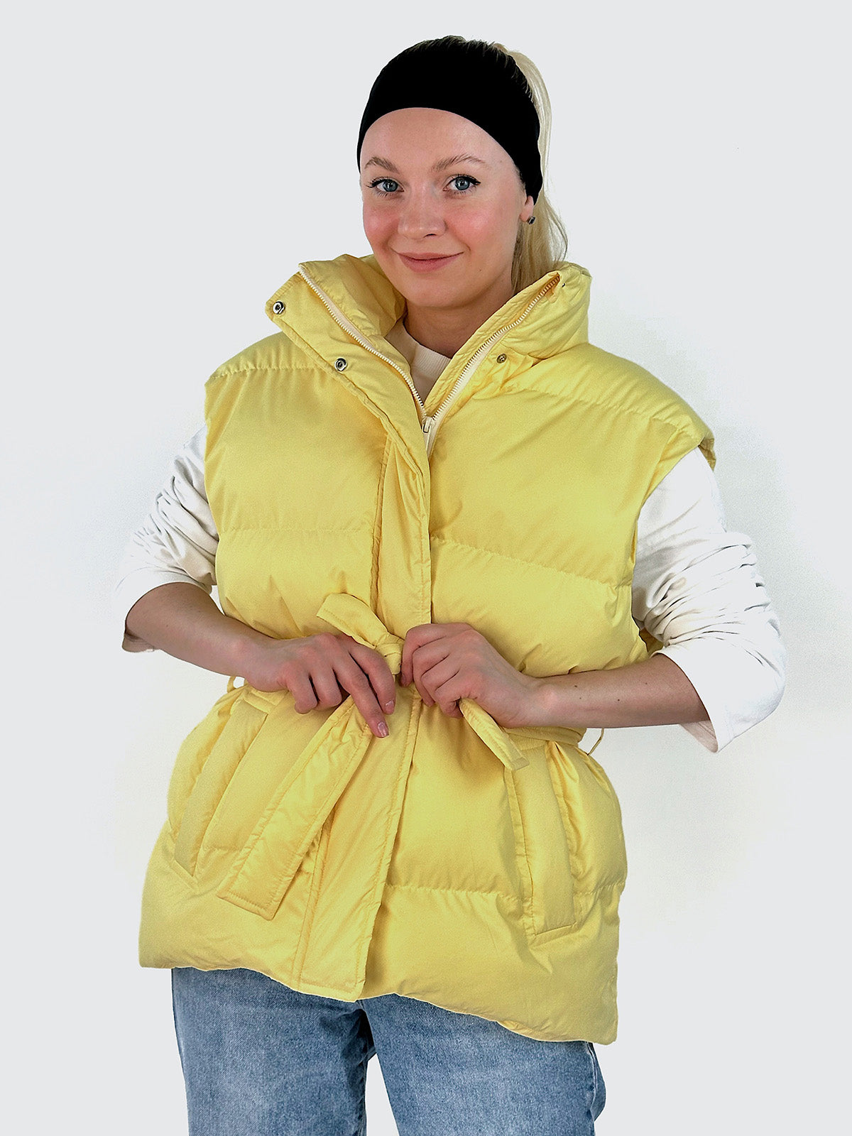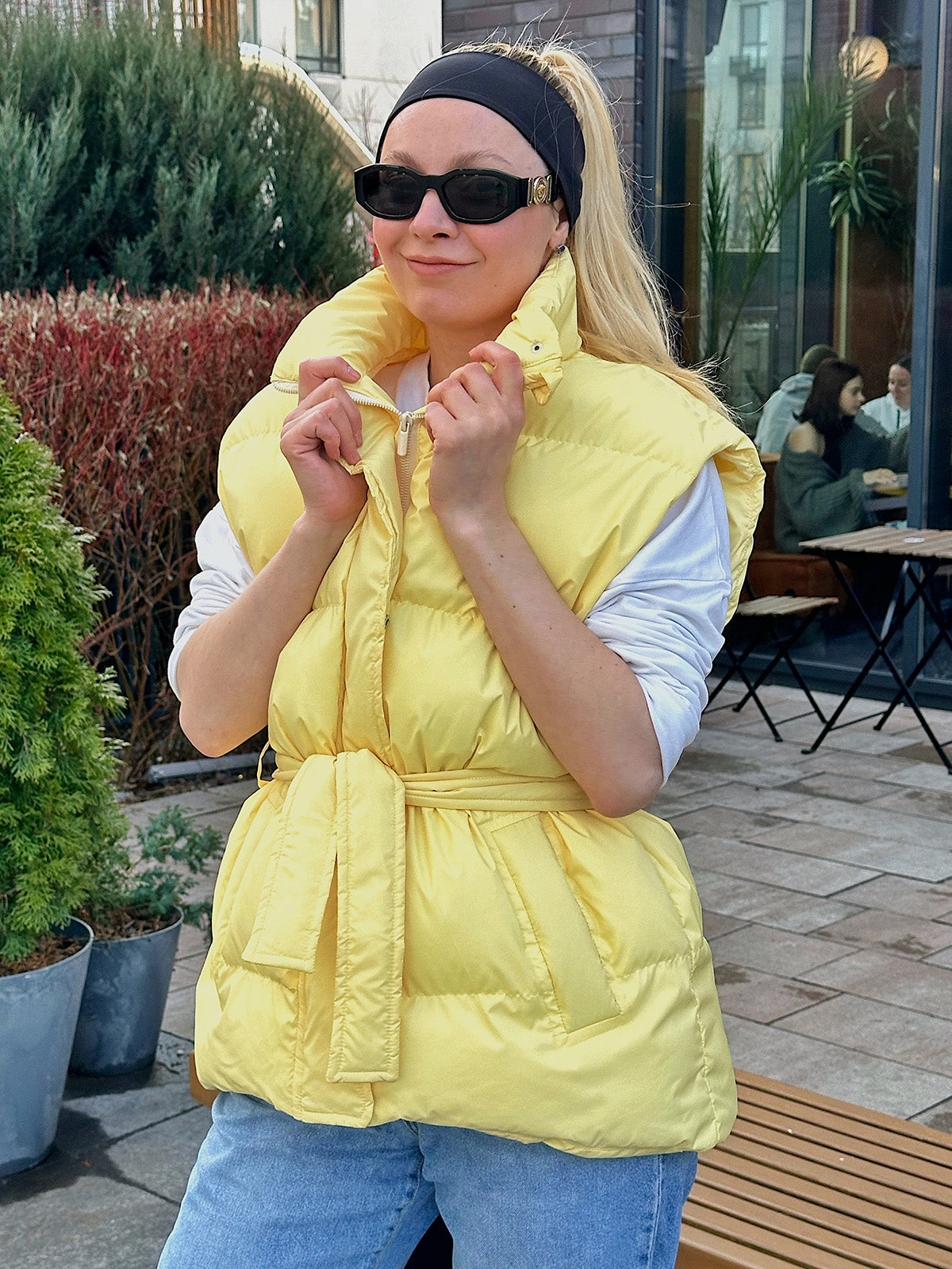 Жіноча демісезонна жилетка на блискавці з кнопками. Має внутрішню кишеню, дві зовнішні та комплектується поясом.