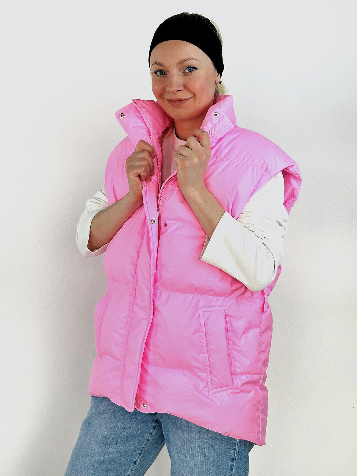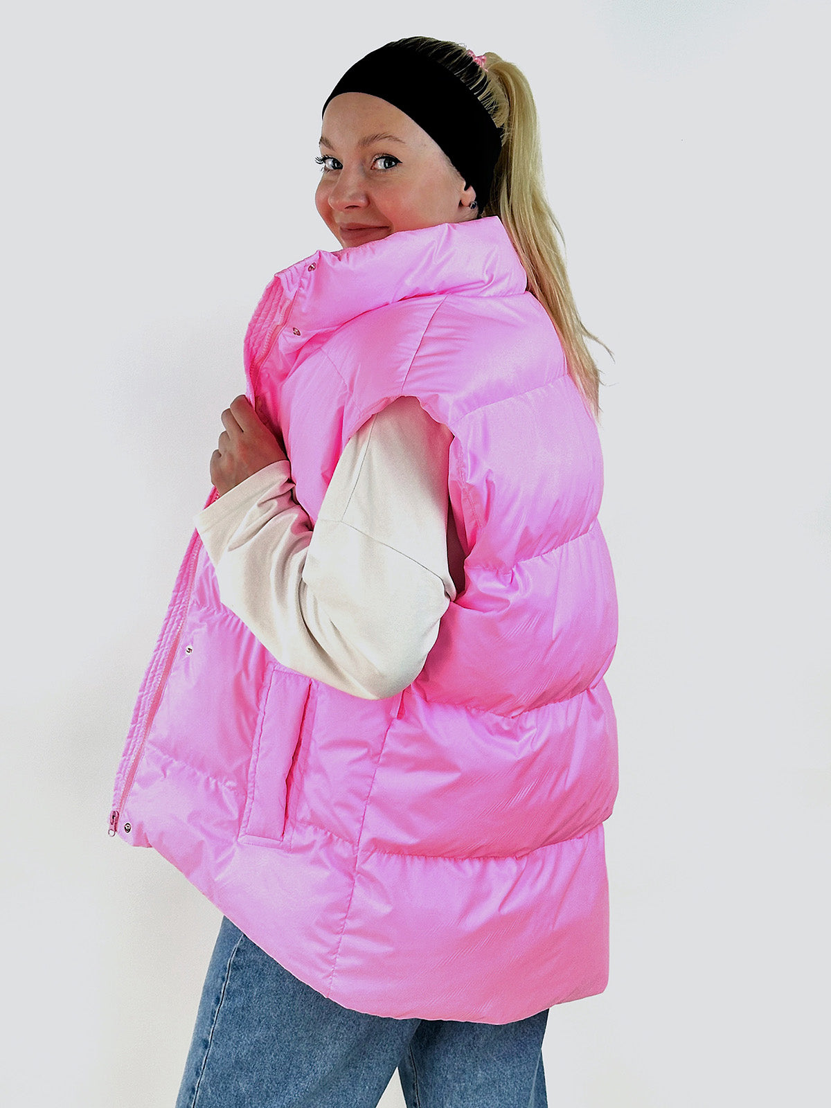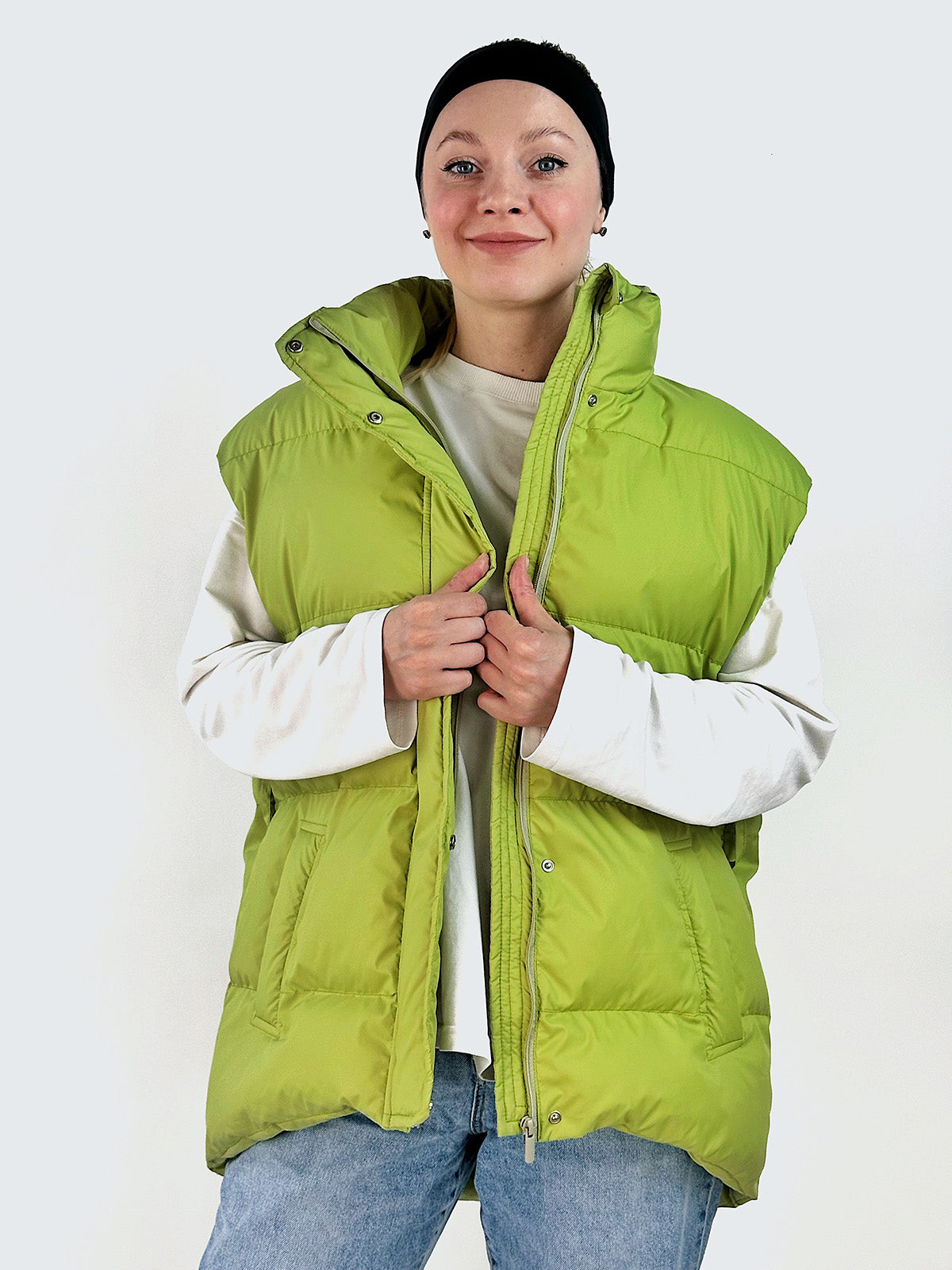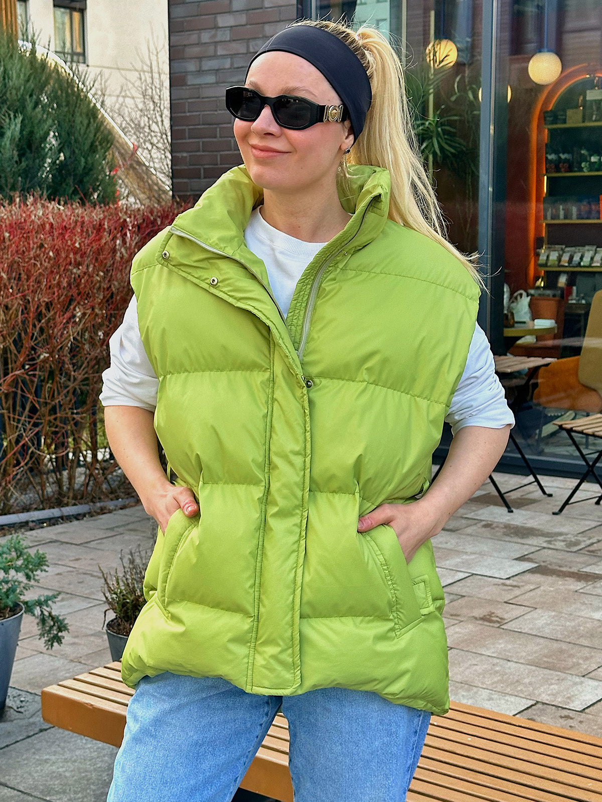 Жіноча демісезонна жилетка на блискавці з кнопками. Має внутрішню кишеню, дві зовнішні та комплектується поясом.